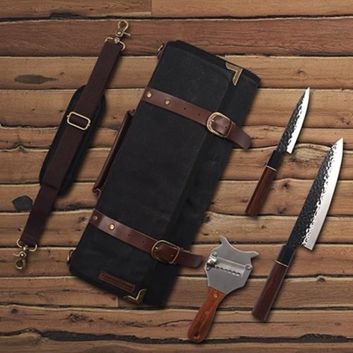 Estuche porta cuchillos de chef, ha sido creado para durar, utilizando lona encerada y cuero de grano superior que le otorgan resistencia y un diseño robusto.